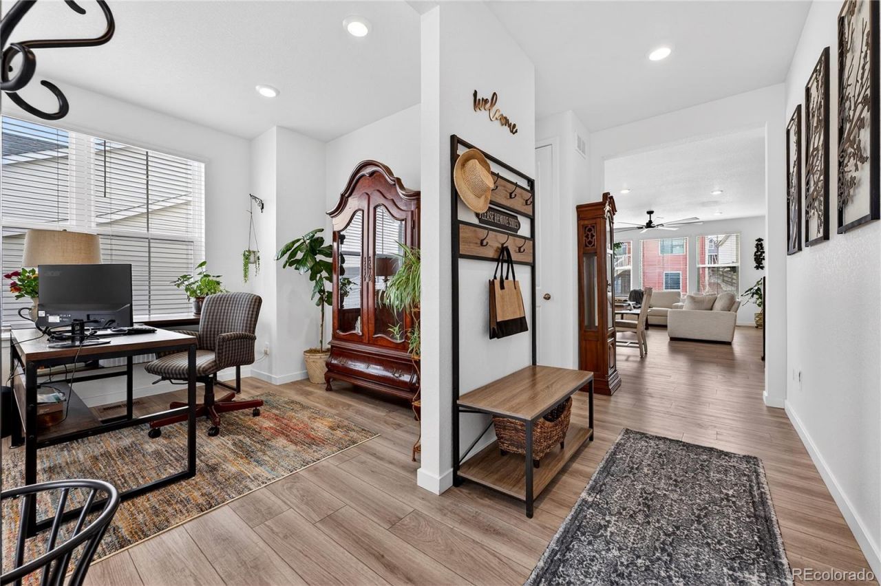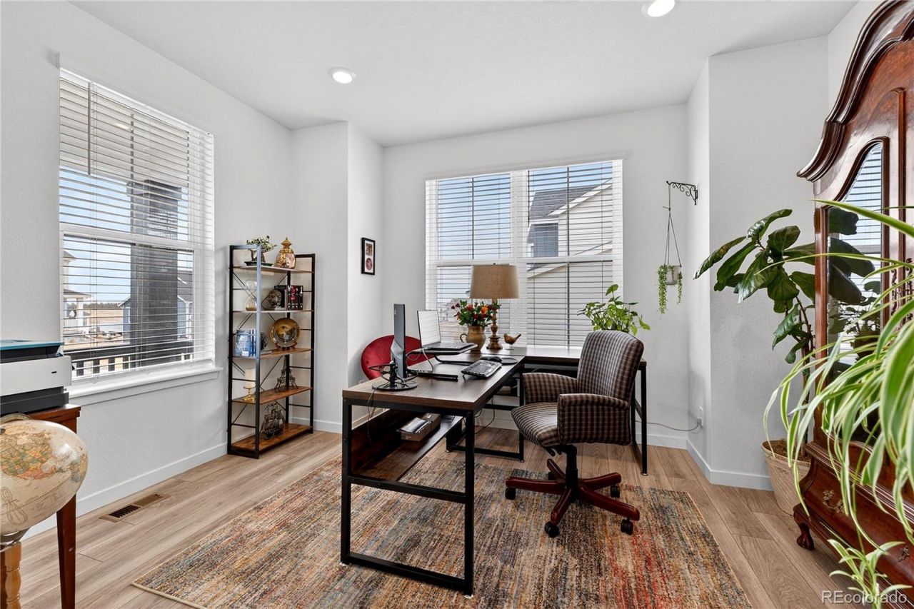 Charming and thoughtfully maintained, this light-filled home offers a peaceful setting with a layout designed for everyday comfort and connection. The open-concept main level is bright and inviting, with large windows that flood the space with natural light and create a warm, airy atmosphere throughout. The kitchen anchors the home with generous cabinetry, ample prep space, and a seamless flow into the dining and living areas, making it ideal for both daily living and entertaining. A dedicated main-level office provides the perfect work-from-home setup. Upstairs, all bedrooms are thoughtfully positioned for privacy and convenience. The spacious primary suite offers a relaxing retreat with an ensuite bathroom featuring dual sinks, a step-in shower, and a walk-in closet. Two additional bedrooms also include walk-in closets, while a secondary bathroom with dual sinks comfortably serves the remaining bedrooms. Pride of ownership shines with extensive landscaping completed in 2024 and 2025, featuring custom rock work and beautifully designed garden beds that enhance both curb appeal and outdoor enjoyment. The covered patio offers a quiet place to unwind, overlooking a thoughtfully designed yard with space to relax, garden, or entertain. A new roof installed in 2023 adds peace of mind and long-term value. Located in a vibrant and amenity-rich community, residents enjoy access to a clubhouse, fitness center, pool, dog park, and community garden, along with multiple parks, open space, and miles of walking trails. The neighborhood fosters a true sense of connection with regular community events and a monthly newsletter, and an exciting addition is on the way with Fika Coffee House coming soon. Blending comfort, care, and community, this home offers a lifestyle that feels both peaceful and connected.