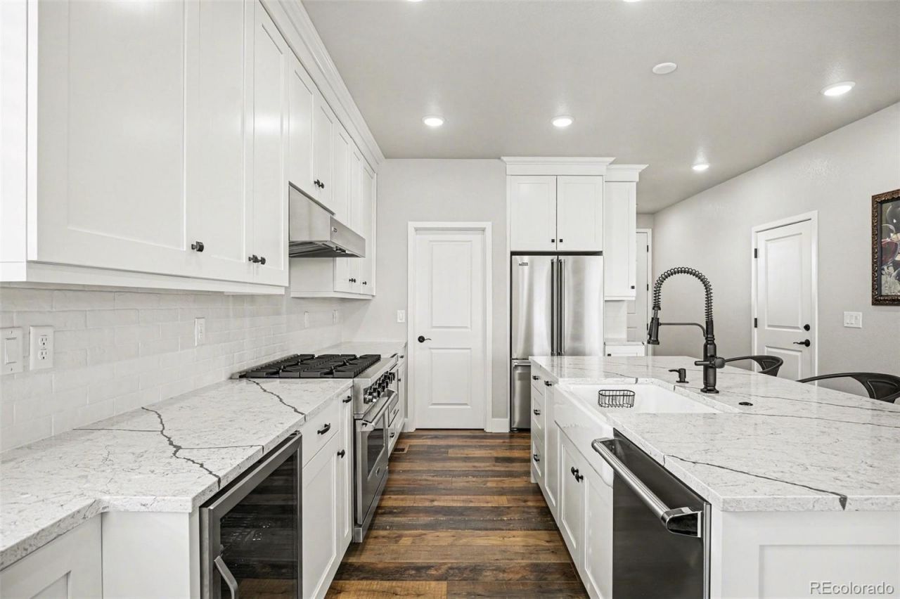 5-bedroom, 5-bath home in the sought-after Barefoot Lakes community featuring numerous upgrades, including a Class 4 hail-resistant roof. The remodeled main floor features engineered wood flooring and an updated kitchen with custom cabinets, soft-close drawers, quartz countertops, and Viking stainless steel appliances. The main level also includes a bedroom with an en suite full bathroom. The upper level features the primary suite with a private bath, along with three additional bedrooms. Wood shutters are installed throughout the home. The finished basement adds additional living space with a game room, dry bar, beverage fridge, and an additional half bath. The front and backyard are fully landscaped and fenced with an added concrete patio and sidewalk. Located in Barefoot Lakes with access to neighborhood lakes, trails, parks, and community amenities, and convenient access to Longmont, Denver, and surrounding areas.