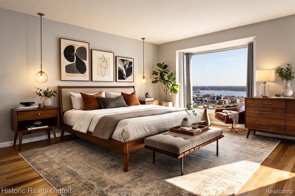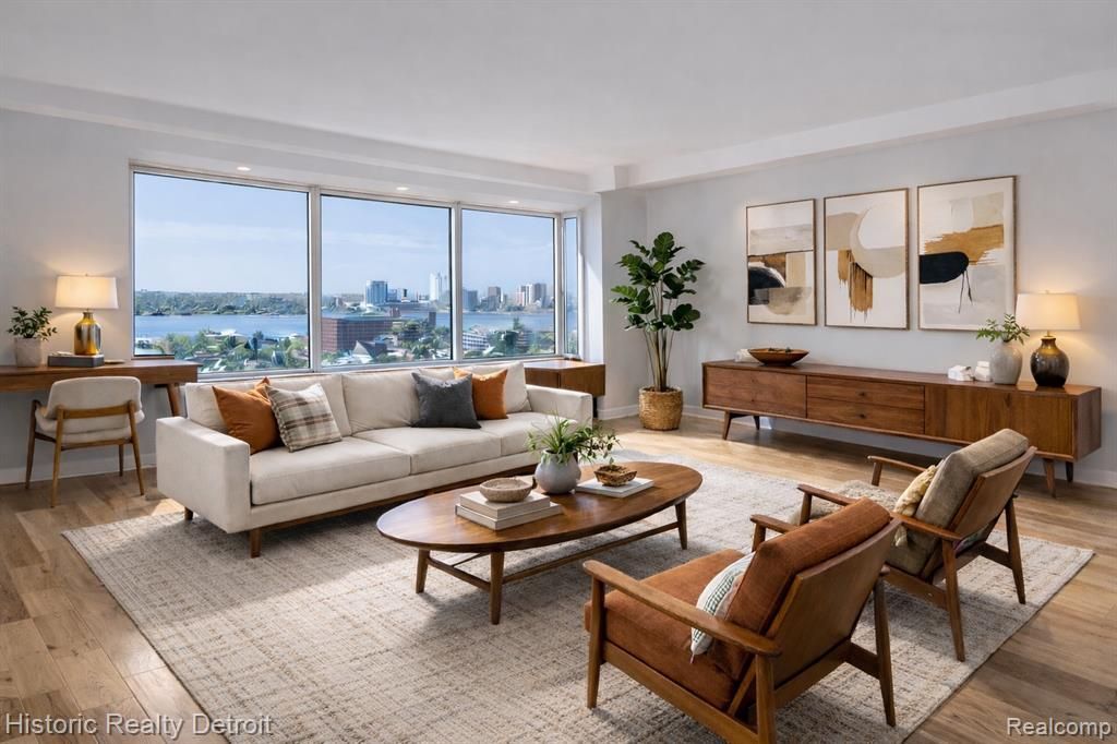 Elevated Riverfront Living in a Mid-Century Modern Detroit Icon! Bright, open, and thoughtfully designed, Unit 1604 at 1300 E. Lafayette offers a unique blend of modern updates and classic mid-century appeal. This one-bedroom, one-bath south-facing condo sits high on the 16th floor, offering panoramic views of the Detroit River and the vibrant international waterway below. Inside, a custom floor plan opens the bedroom to the living area, creating an airy, loft-like flow that’s ideal for modern living. Expansive windows bathe the space in natural light and frame sweeping views that stretch from Belle Isle to the Ambassador Bridge. The updated kitchen features granite countertops, stainless steel appliances, and dark wood cabinetry, while the renovated bath is finished with timeless tile and polished fixtures. Life at 1300 E. Lafayette offers more than just a beautiful home — it’s a gateway to a luxury lifestyle. Residents enjoy two heated outdoor pools, tennis courts nestled among green space, a well-appointed fitness center, 24-hour concierge service, and secure entry. The building’s on-site laundry, optional parking, and classic mid-century modern architecture make daily living both stylish and seamless.