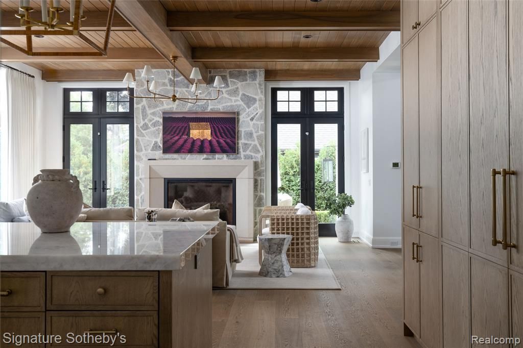 Built in 2023 by renowned builder Hunter Roberts, this 6-bedroom, 7.1-bath home spans over 8,000 square feet including the finished lower level, and was designed by award-winning architect Brian Neeper with interiors by Jessica Neeper. Featured in Twenty Magnificent Homes by Midwest Architects and recognized with multiple Detroit Design awards, the home reflects a balance of modern design and timeless craftsmanship, tailored for both everyday living and refined entertaining. A thoughtfully executed layout unfolds with intention, beginning with a distinctive circular entry that sets the tone for the home’s architectural flow. Expansive living spaces are defined by layered ceiling details, curated materials, and designer fixtures. The kitchen anchors the main level with quartzite surfaces, custom cabinetry, and premium appliances, seamlessly connected to the formal dining room through a butler’s hall. The living room is elevated by a striking stone fireplace with a full-height fieldstone chimney and wood-paneled coffered ceilings, while a detailed library offers a more intimate retreat. Upstairs, the primary suite features vaulted ceilings with exposed beams and oak detailing, paired with a spa-like bath and spacious dual closets. Additional ensuite bedrooms, a loft with integrated workspace, and a dedicated laundry room with dual washer and dryer units enhance functionality. The lower level extends the living space with a recreation area, wet bar, temperature-controlled wine room, fitness room, and guest suite. The exterior living is as compelling as the interior. A resort-style backyard features a pool with stone surround, lush landscaping, and a covered outdoor kitchen. Positioned within Quarton Lake Estates, just minutes from downtown Birmingham, parks, and everyday amenities, this home offers a connected lifestyle without compromising privacy.