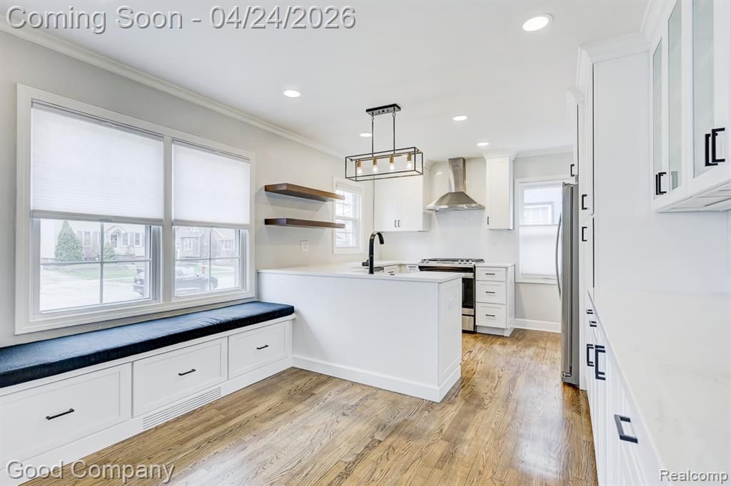 Open house! Saturday, April 25th from 12pm-2pm. Beautiful updated bungalow in Pleasant Ridge with a bright, fresh interior loaded with thoughtful updates throughout. Light-filled entry living room features hardwood floors and a gas fireplace, flowing into an open dining area with built-in bench seating and glass-front upper cabinetry. Fully renovated kitchen offers ample cabinet and counter space, stainless steel appliances, farmhouse sink, open wood shelving, and stylish pendant and recessed lighting. Two nice sized bedrooms on the main floor share an updated full bath with subway tile and a classic patterned tile floor, and one bedroom includes a sliding glass door with direct backyard access. Head upstairs to a large primary retreat with vaulted ceilings, skylights, a mini-split system, and generous closet space. Finished basement provides a great additional entertainment space with LVP flooring, a full second bath, separate laundry room, and built-in storage. Private fenced backyard with a paver patio, pergola, and detached three-car garage featuring insulated doors, epoxy flooring, and an EV charger. Major updates include a new furnace and A/C (2020), upgraded 200-amp electrical panel, spray foam basement insulation, new gas fireplace insert, and a full kitchen and dining room renovation (2022). Walking distance to the Pleasant Ridge community center, fitness club, and pool, with easy access to Woodward Ave shopping and dining. Welcome Home!