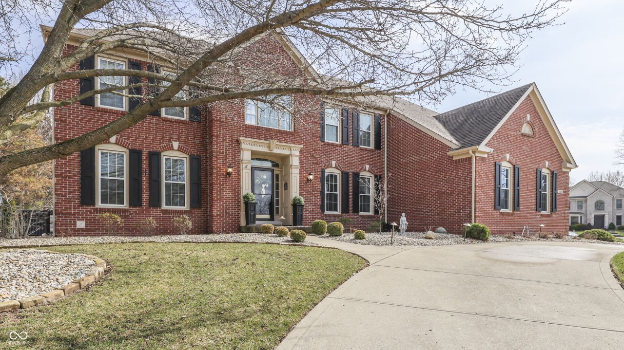 Located on an almost half-acre corner cul-de-sac lot in Auburn Trace within Center Grove Schools, this beautifully maintained 4-bedroom, 4.5-bath home offers 5,264 total square feet of living space including finished basement. Explore this home via interactive 3D home tour, complete with floor plans. The stately brick exterior features a circular front driveway and 3-car side-load garage with separate driveway. The backyard is lined with arborvitae for privacy with enclosed wrought iron fence, offering a pool, sun deck, and shaded pergola perfect for entertaining. Inside, the two-story family room with soaring windows and gas fireplace opens to a well-appointed kitchen featuring bamboo floors, Palomino Maple cabinetry, granite counters, large island, Whirlpool stainless appliances, and a SubZero drink fridge. The primary suite includes a Jacuzzi tub, separate shower, dual vanities, and his-and-hers walk-in closets, while the upper level offers three additional bedrooms, two full baths, and a versatile loft. The finished basement features a full bar and kitchenette with stone accents, built-in microwave and dishwasher, plus a great room, rec room, bonus room, possible 5th bedroom or office, and plenty of storage options. Updates include HVAC, whole-home generator, and tankless water heater.
