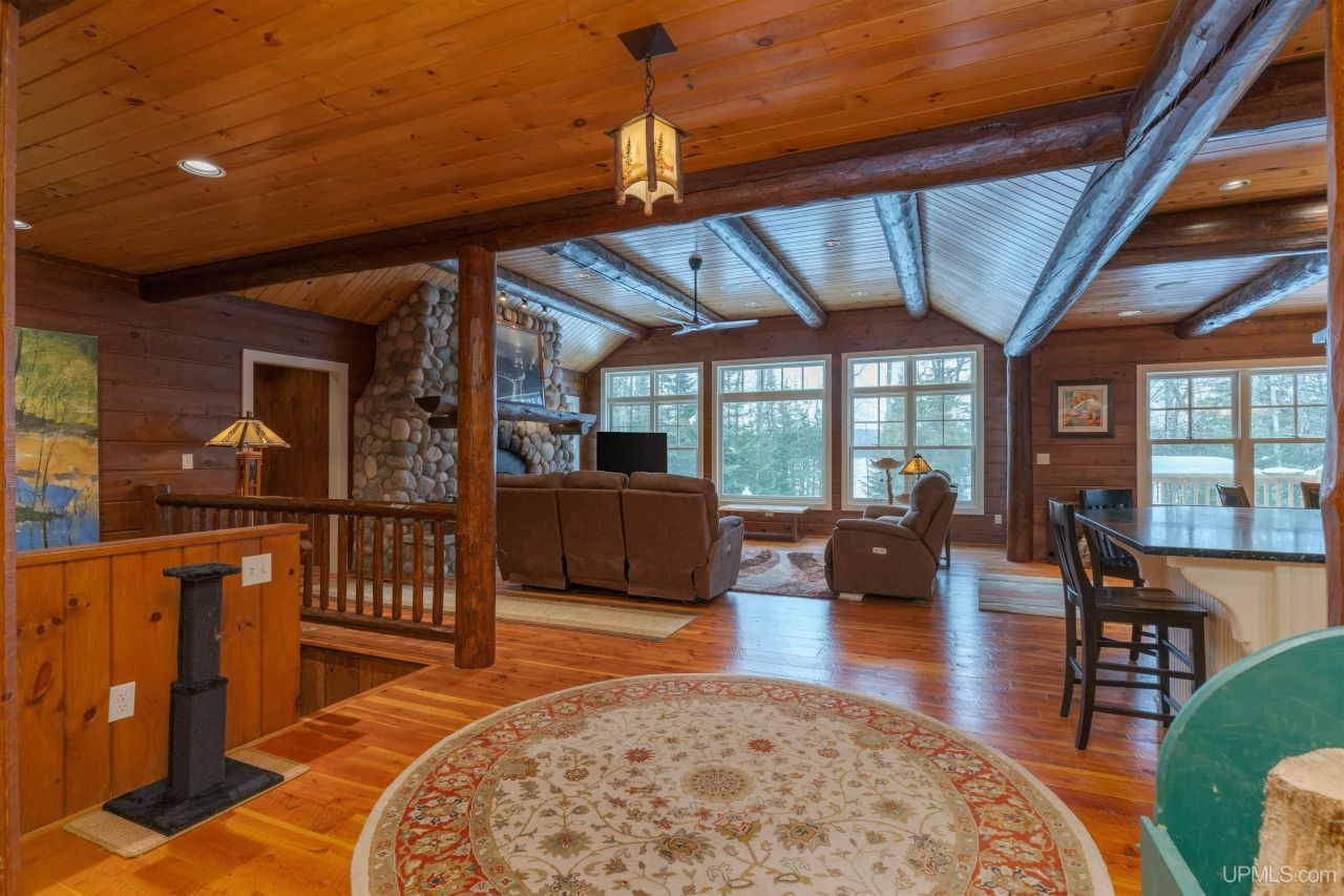 This spectacularly unique custom built 4 bedroom, 2.5 bath home on well over 5 acres was constructed with pride, passion and great attention to detail. Encompassing nearly 4,400 square feet of luxurious living space, that starts with the 2-car attached garage leading to the laundry/mud room with ample storage and half bath. From there, enter the custom kitchen that every chef would love, with soapstone countertops and plenty of room to entertain - you may never want to eat out again - plus walk-in pantry for all your storage needs. Living and dining rooms are adjacent as well as a bonus screened porch with access to the large deck thats a great place to enjoy beautiful mornings enjoying coffee or gathering for after-dinner drinks. There are 2 beautiful stone woodburning fireplaces, one on the main level and one in the family room in the walkout lower level. Log beams adorn the ceilings, and you have gorgeous hand-sawn wood floors throughout the home. There are 2 main floor bedrooms, one being a primary suite with ensuite, including walk-in tiled shower, spa bath, and dual vanity sinks. The lower level has two bedrooms with another large bath. This home even has a large walk-in sauna! The exterior is beautifully landscaped with a walking path down to the water. There are so many more amenities than your average waterfront home! 153-acre Homan Lake is a private lake and reaches depths of about 35 feet. Its also no-wake, so its ideal for fishing, kayaking, canoeing, and swimming. Homan Lakes east shore is the serene neighborhood of "Waasanoode," the Ojibwa term for "Northern Lights." This private location displays them most beautifully across a dark, starry sky with no light pollution to detract from your view. Facing west, the residences along this shoreline have spectacular sunset views. Each parcel is spacious and deeded covenants maintain the integrity of this lake community.