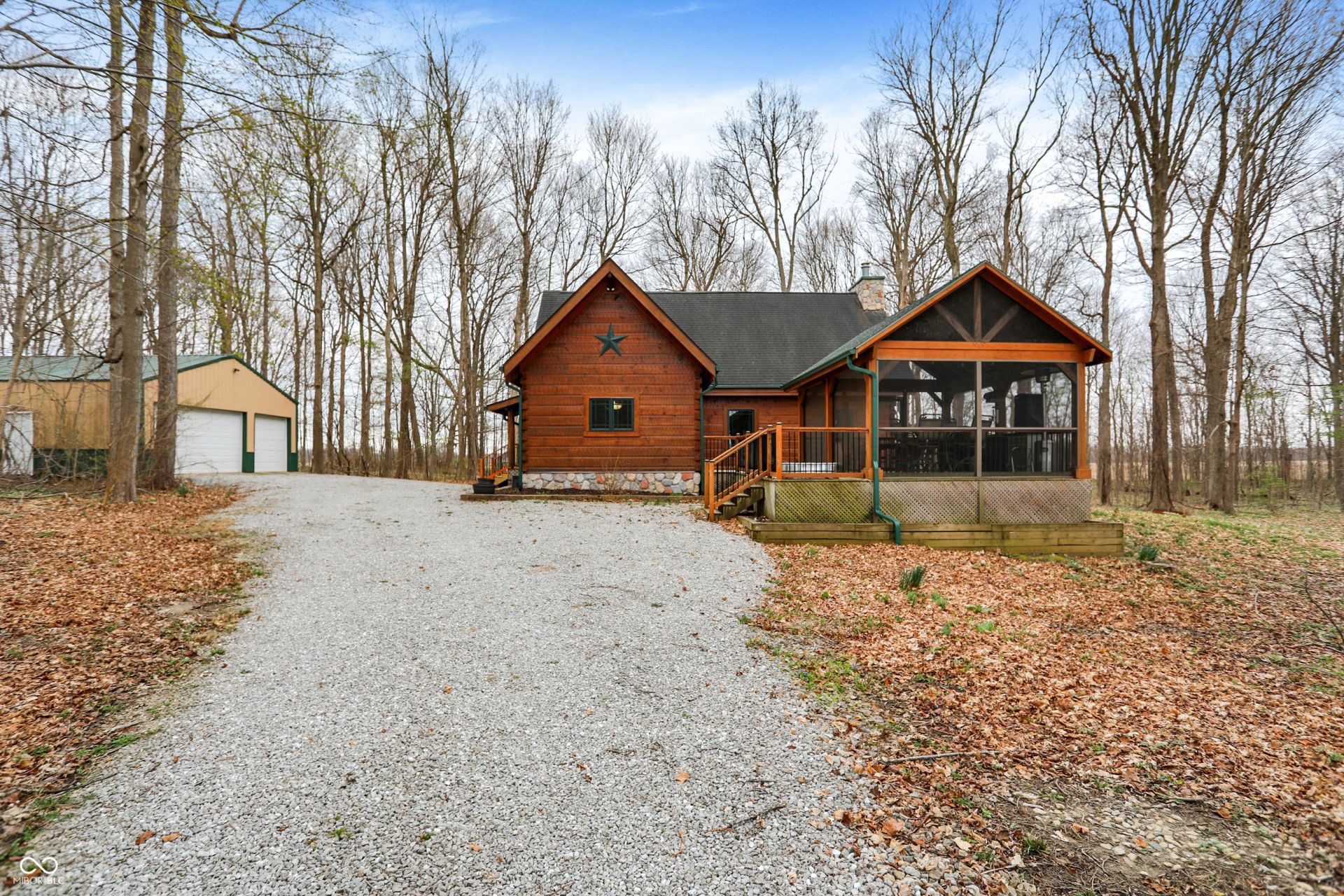 Rare opportunity to own a stunning Barna log home, built in 2008 and set on just over 12 picturesque acres. This exceptional property offers a perfect balance of open farmland, mature woods, and manicured lawn, creating a private and serene retreat. Approximately five acres are currently farmed, six acres are wooded, and one acre is maintained for everyday enjoyment. The home features three bedrooms and 3.5 baths, with a desirable main-level primary suite for added convenience. Two additional bedrooms are located upstairs, while the finished basement expands the living space with a spacious family room, an impressive custom bar, a dedicated workout room that can easily serve as a fourth bedroom, and a golf simulator room designed for year-round enjoyment. The kitchen is both stylish and functional, showcasing granite countertops, a center island, stainless steel appliances, and a generously sized pantry. The living room is a true centerpiece, highlighted by a dramatic two-story stone fireplace and exposed wood beams that enhance the home's rustic elegance and warm character. Outdoor living is equally impressive, featuring a 20x16 screened-in pavilion, a wrap-around deck, and peaceful views of the surrounding woods-perfect for relaxing or entertaining. Car enthusiasts, hobbyists, or those needing additional storage will appreciate the two fully equipped pole barns measuring 30'x48' and 24'x32', both with concrete floors, electricity, and a 4-post car lift. The 24'x32' barn has spray foam insulation. Significant updates have already been completed, including a full exterior log wash, stain, and clear coat on the home, pavilion, and railings in 2025, fresh interior paint on all drywall in 2025, and a complete HVAC system replacement in 2022. This is a truly remarkable property offering space, privacy, and modern comfort in a beautiful natural setting.