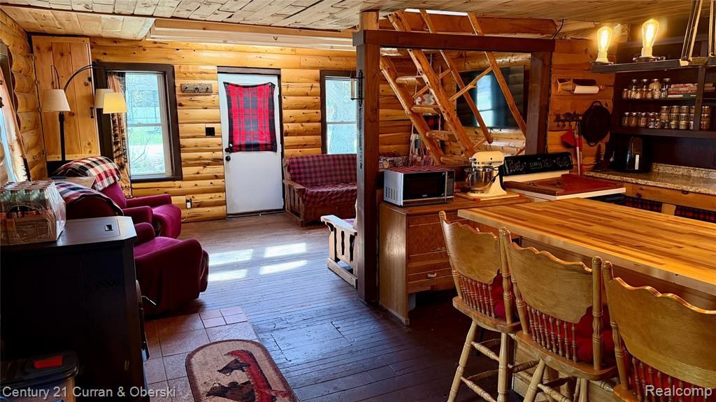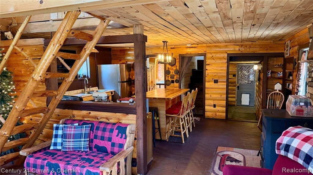 Northern Michigan cabin character with room to gather, unwind, and make it your own. This 3-bedroom, 1-bath home offers a warm, finished interior with the kind of rustic charm buyers immediately connect with -- natural wood throughout, vaulted cabin lines, open living space, and a layout that feels both inviting and functional. The kitchen opens directly into the main gathering area, creating an easy flow for everyday living or weekend hosting. Upstairs loft space adds flexibility for additional sleeping, office space, or guests. Outside, the black log exterior gives the home strong curb appeal and a distinctive look that stands out in the market. A covered front porch, large patio area, fenced yard, and spacious lot create multiple outdoor living options, whether for summer evenings, fire pit nights, or extra room for toys and storage. Located close to Houghton Lake, this property works equally well as a full-time residence, up-north getaway, or investment opportunity.