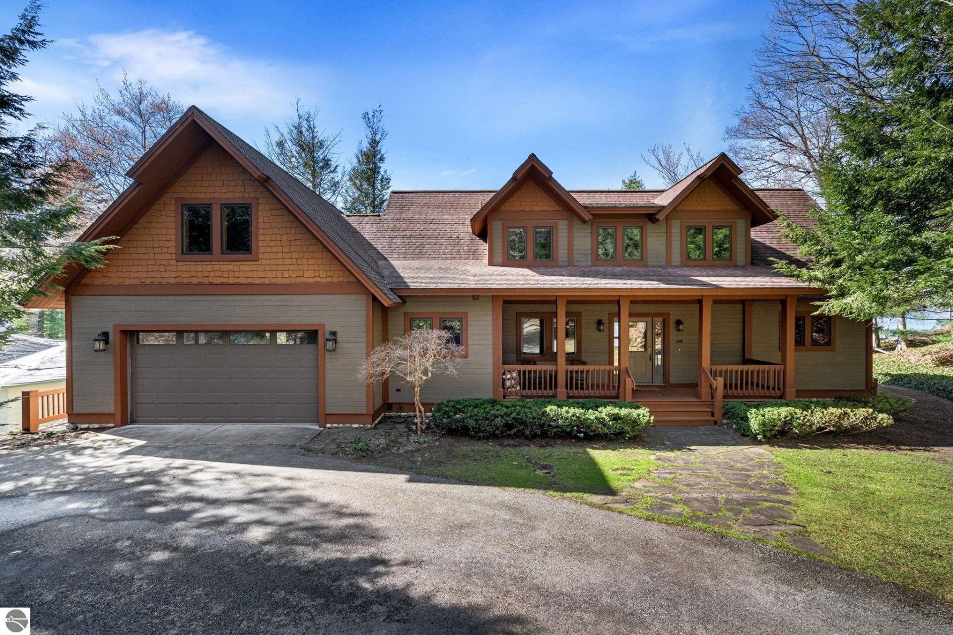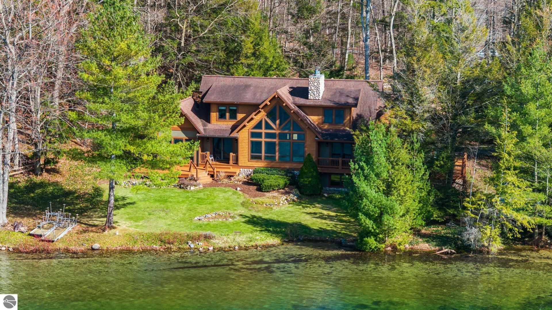 Here is your opportunity to own a custom-built, large family home on highly sought-after Long Lake in Traverse City, just 20 minutes from downtown. Situated on an estate-sized, one-acre lot with 142 feet of private sandy waterfront, the home is tucked in a quiet cove that provides privacy while still offering expansive lake views. The kitchen, dining area, and great room flow seamlessly together for true open-concept living, ideal for entertaining and family gatherings. The great room features vaulted, tongue-and-groove ceilings, exposed beams, and an impressive natural-stone, wood-burning fireplace. The first-floor primary suite includes a walk-in closet, private balcony with lake views, and an ensuite bath; two additional large bedrooms upstairs, with tongue-and-groove ceilings and striking architectural lines, are accompanied by a massive bonus room ideal as a fourth bedroom, kids??? bunk room, or game room. The finished walkout lower level includes its own bathroom and additional living space to make hosting lake gatherings effortless. A combined five garage stalls between the attached 2.5-car garage and detached 3-car garage provide plenty of room for all your lake toys and storage needs. Enjoy morning coffee or evening cocktails in the three-season room with sweeping lake views. The private, wooded setting is rich with wildlife (deer, birds, and loons) and offers excellent fishing right off the dock. Mature hardwoods and pines cover the property and a circular drive provides easy access. Located in the coveted Forest Park area, this home is an ideal setting for enjoying the best of Northern Michigan lake living with close proximity to everything Traverse City has to offer.