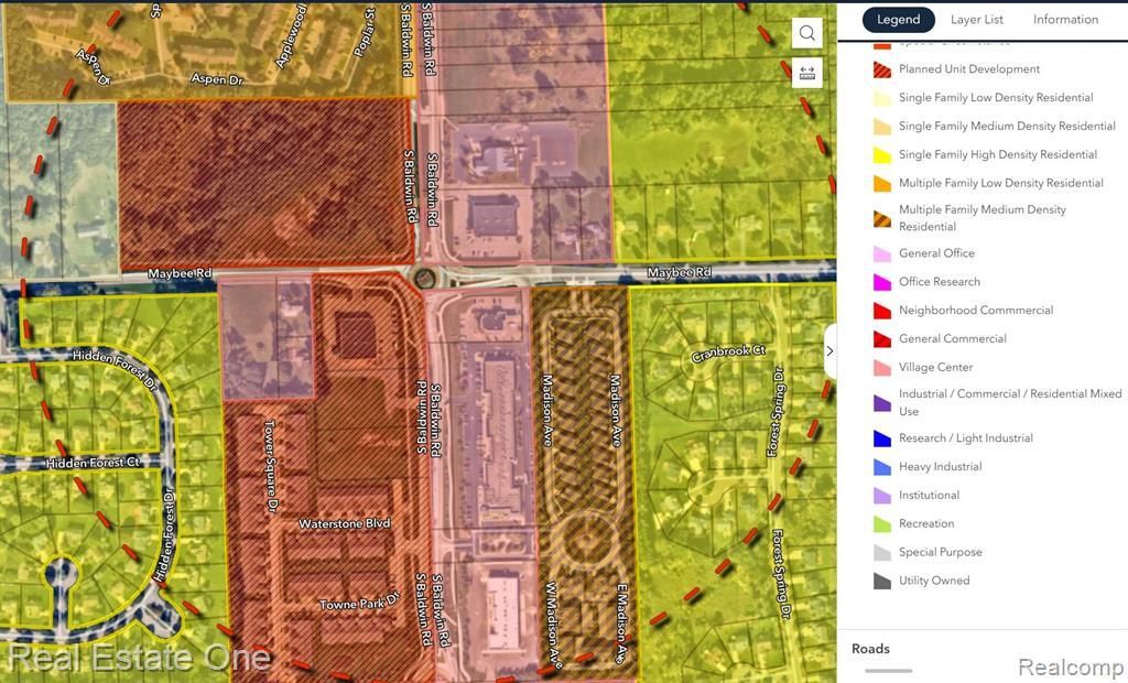 1.68 acres (1.43 net excluding R.O.W.) just West of the intersection of Baldwin Rd and Maybee Rd. Zoned R2 with an overlay zoning of Gingellville Village Overlay District. The intersection includes newer built Walgreens, CVS, Chase Bank, Bad Brad’s BBQ, Johnny Black’s Public House, Orion Grill and Great Lakes Athletic Club. This parcel is adjacent to Redwood Apartments to the South. The overlay district includes commercial, office and multi family uses and may require a PUD which is typical for this zoning district. The subject parcel is rolling with some slope and mature trees in the Southwest corner. Ideal use would be a multi family development, early learning school, office, senior living or a restaurant. Single family or condos may also be a suitable use for the property. Land contract terms available for qualified buyers. Underlying zoning is R2 single family and sewer is located to the south at the edge of the Redwood Apartment development or about 185 ft East along the south side of Maybe Rd.