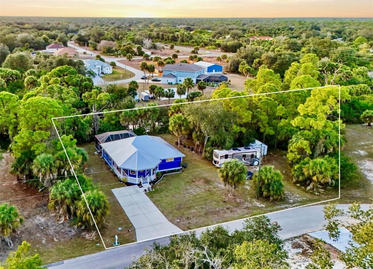 Welcome to Blueberry Bungalow, situated along 233ft+ waterfront and is a thoughtfully designed coastal retreat where craftsmanship, comfort and character come together beautifully. Your .58 acres are tucked away yet close to everything Port Charlotte has to offer, this canalfront home feels peaceful and private while still being minutes from shopping, dining, medical facilities and everyday conveniences.Custom built by the highly respected Thornberry Custom Builders, this home was designed with intention from the ground up. From the moment you step inside, natural light fills the open living space, highlighting soaring ceilings, quality finishes and a calming color palette inspired by the waters of Boca Grande. The signature wall color, Quietude, sets the tone for a home that instantly feels relaxed and welcoming. The family room is anchored by a cozy gas fireplace, creating a natural gathering space that feels warm and inviting.The kitchen is both functional and full of personality, featuring Cambria quartz countertops, shaker-style wood cabinetry with dovetail soft-close drawers, stainless steel appliances and gas cooking. A barn door adds character while providing discreet access to the pantry, and the large island offers plenty of space for casual meals, entertaining or everyday living. Plank tile flooring flows throughout the home, complemented by crown molding, 51/4-inch baseboards and tall interior doors that enhance the sense of openness.Built for efficiency, durability and peace of mind, the home includes a metal roof, impact windows, spray foam insulation, hurricane tie-downs, gas fireplace, gas water heater, gas dryer and an elevated stem wall for added height and protection. Additional features include an RV hookup and a 50-amp connection for a future shed, offering flexibility for storage, travel or hobbies.Outdoor living is just as special, with two distinct exterior spaces designed for different moments. The expansive screened birdcage offers the perfect place to gather, entertain or unwind while enjoying the outdoors. The private purple porch serves as its own spa-like retreat, complete with an infrared sauna that turns everyday living into a true self-care experience.The primary suite is spacious and serene, offering room for a king-size bed, a sitting or desk area, two closets including a walk-in, and a well-appointed ensuite with dual sinks, a makeup vanity, a walk-in shower and a linen closet. Doorways throughout the home are wheelchair accessible, reflecting the thoughtful design woven into every detail.Thoughtfully designed for easy Florida living, the home features front and rear covered porches, a spacious screened birdcage and peaceful canalfront views that invite you to slow down and enjoy the outdoors year round. With no immediate neighbors on either side and an optional adjacent parcel available, privacy and flexibility are rare bonuses that make this property feel even more special.Adding even more opportunity, the adjacent parcel to the right of the home is included with the purchase of your home, which includes a shed that's currently located on the lot and over 25,000sqft to roam! Whether used for added privacy, storage or future plans, it provides flexibility rarely found.Blueberry Bungalow is not just a home, it is a lifestyle. A place to slow down, gather, retreat and truly enjoy where you live!