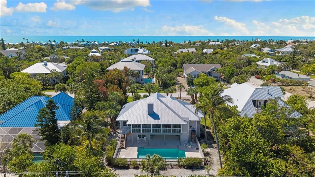 Located along the charming and quiet Las Tiendas Lane in the East End of Sanibel, this 3 bedroom plus den/ 3 bath elevated island home offers a rare opportunity to own in one of Sanibel's most coveted locations. Surrounded by lush tropical landscaping, the property is set on a spacious lot along a quiet, shell-lined street, providing both privacy and a true sense of Old Florida charm as well as only a five-minute walk to Sanibel's world-renowned beaches. Inside, the home features a bright and open floor plan with abundant natural light, three comfortable bedrooms, and a bright den/office providing a seamless flow that is perfect for both relaxing and entertaining. The kitchen opens to the main living areas, while three sets of French doors lead to a generous screened lanai overlooking the pool area-creating an elegant connection between indoor and outdoor living. A new, durable metal roof adds both style and peace of mind. Step outside to your private outdoor oasis, complete with an oversized pool and ample space for lounging or entertaining in a lush tropical setting. Conveniently located near bike paths, shops, and dining, as well as proximity to the Causeway, this affordable home with no HOA fees is perfectly positioned to enjoy the best of island living. Whether you're looking for a full-time residence, vacation getaway, or investment opportunity, this property captures the essence of the Sanibel lifestyle in a quiet, desirable location that is equidistant from both the Gulf and the Bay. Don't miss this opportunity to own the least expensive elevated single-family East End island home currently on the market!