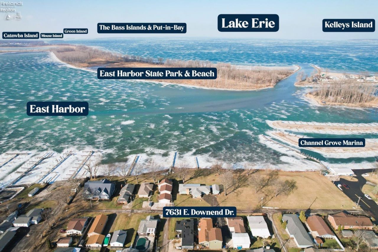 Location location location! Waterfront home on 3 lots for sale with a front row seat to breathtaking East Harbor. This 3 bedroom ranch home is prime for renovation, or a buyer may elect to take it down and start fresh. The house sits on a 150' wide parcel. Located on private Downend Drive which sits next to Channel Grove Marina. Once owned by Mr. Downend who created this neighborhood and kept this lot for his personal home. This legacy property has never before been offered for sale. Now is your chance! Direct views out to East Harbor State Park/Beach right behind the house. Close to the inlet so you can be on the lake within minutes and headed to your favorite island. Dock is owned by the homeowner, it sits on ODNR underwater land with $140/yr dues paid to ODNR for the permit. No HOA cost or dues! There is a low $250 per year annual voluntary contribution for road upkeep and plowing. For someone looking to build a home there is an added benefit. A 0.49 acre underwater parcel is being split from the lot next door and added to this parcel making it a total of 0.92 acres which could help with building allowances. This sprawling ranch has a basement, 3 season sunroom facing the harbor, a 2 car attached garage, a 1 car detached garage, and the roof was replaced in 2014. This location not only boasts amazing views but is also in close proximity to highway access, area attractions, restaurants, and ferry service to the islands. Quiet, no outlet street, and golf cart friendly. Imagine summer mornings sipping coffee while watching ducks and bald eagles fish in the harbor. During winter watch anglers set up their fishing shanties on the ice. Summer sunsets here are amazing, with the sun setting directly over the harbor. East Harbor is close to both Kelleys Island and South Bass Island / Put-in-Bay, making island hopping in your boat a breeze. Enjoy lake days and summer nights with friends and family at your own waterfront paradise at 7631 E. Downend Drive.