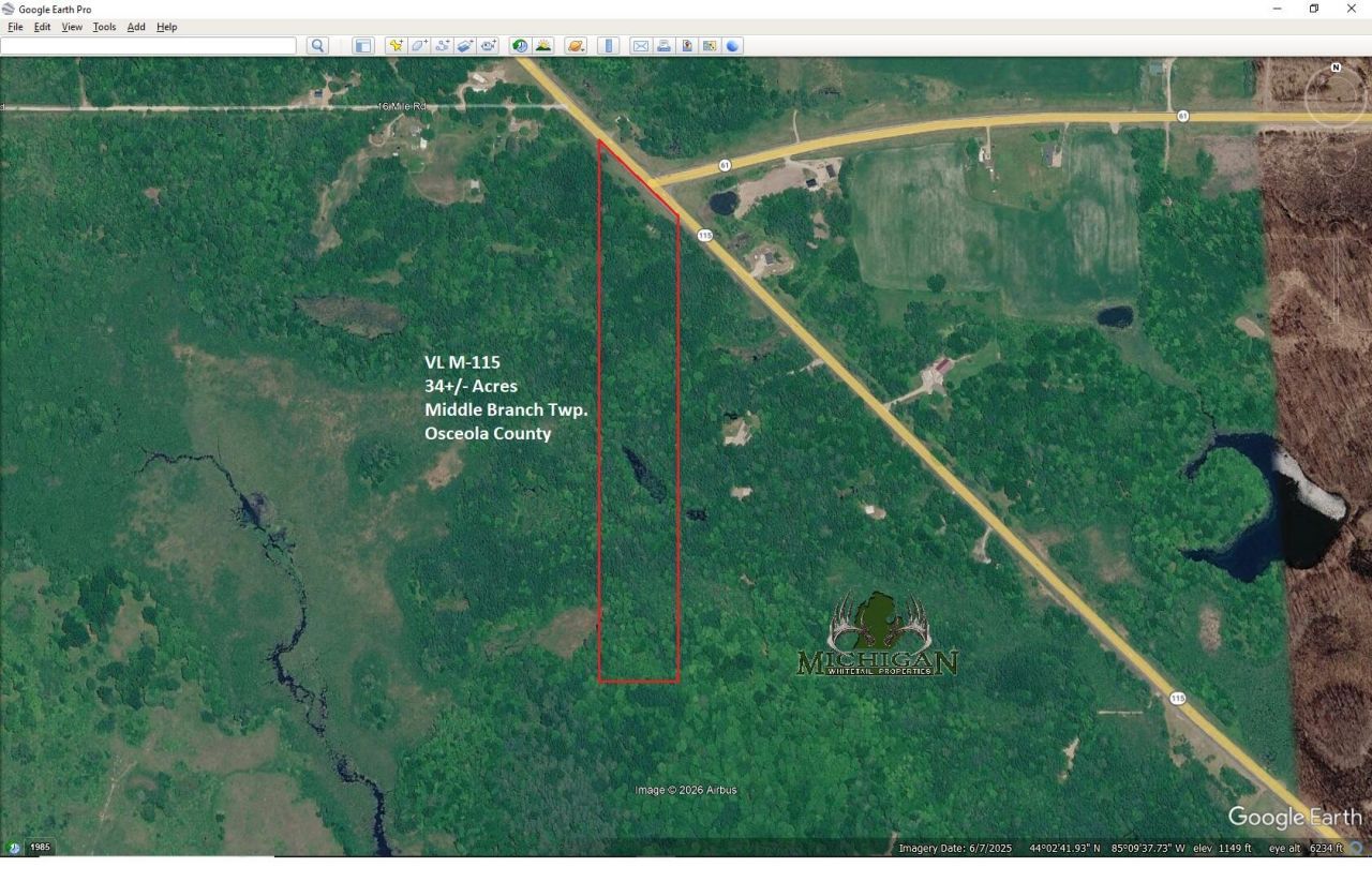 This approximately 34 acre wooded parcel is ideally located on M 115 just south of the M-61 intersection and a few miles south of Marion in Osceola County, offering a combination of accessibility, privacy, and strong recreational and building potential. With paved road frontage and year round access, the property provides convenient entry for equipment, campers, or future construction. The land is predominantly wooded with a great mixture of hardwoods, cedars and pines with several established old trails, along with a small pond/wetland area that enhances wildlife habitat. The high & dry areas of the property present several potential locations suitable for a hunting camp, cabin, or recreational retreat, subject to township zoning and permitting. Whether you envision a seasonal deer camp, a weekend getaway, or a long term up north base, this parcel offers flexibility for a variety of uses. Well suited for Michigan whitetail hunting, the property provides excellent cover and .... natural funnels for archery, rifle, and late season hunts. Deer and turkey frequent the area, especially near the wetland area. Beyond hunting, enjoy year round recreation including hiking, fall color viewing, and winter activities. If youre searching for Northern Central Michigan acreage with road frontage, wildlife, trails, and the potential to build your own camp or cabin in a proven recreation area, this Osceola County property is a standout opportunity. I noticed a decent amount of deer sign while walking the property and several potentially great stand locations, including an old ground blind overlooking the wetland area that could be upgraded with a new blind to provide an excellent hunting spot. Dont miss out & give me a call today if interested! **Maps contained on our sites are there to simply depict the overall layout or shape of a given property and show what it looks like from an aerial view. These maps are neither a legally recorded map, nor any type of a legal survey and should never be used as such. Also Acreage amounts are displayed as according to the information we have obtained through local government and are in no way guaranteed or warranted to be exact.**