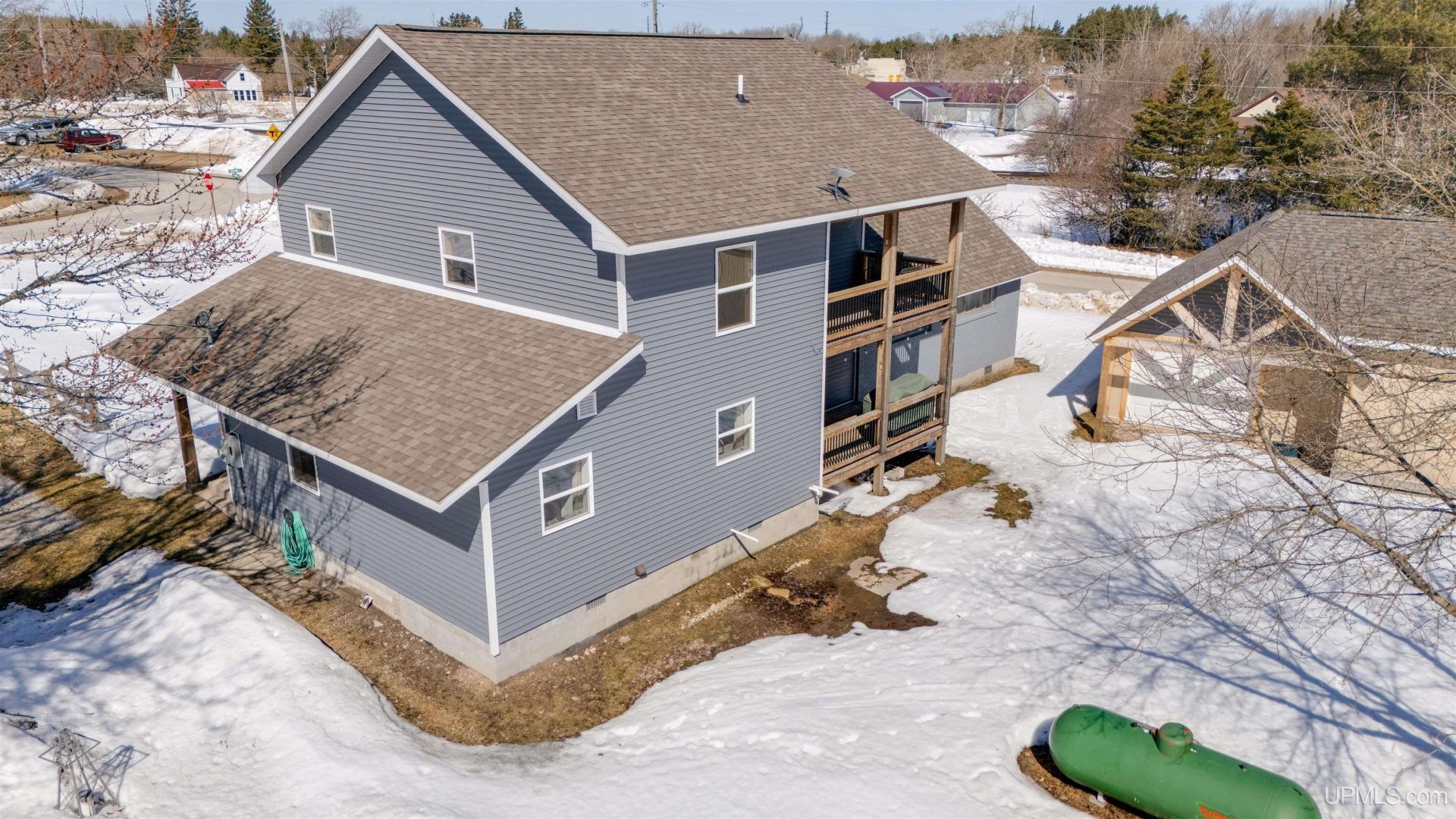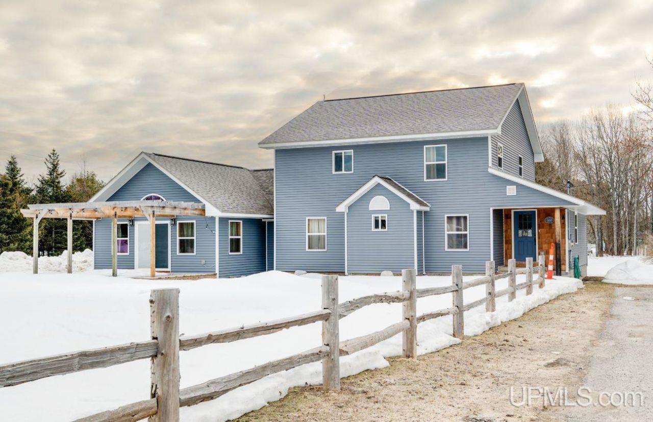 This 6 bedroom home is surrounded by a sportsmans paradise. Whether you fish, hunt, 4-wheel, snowmobile, or just enjoy a long walk in the woods, this location will offer you year round recreation. No better spot to gather the gang with over 2500 square feet. Totally and meticulously updated, everything is new, from the plumbing, heating, electrical, septic and roof to the kitchen, appliances, paint and floorcoverings. Construction was completed in 2023. See the seller notes on the project in associated docs. Cooks will appreciate the16x26 open kitchen with long stretches of unique quartz countertops and soft close cabinets. The adjoining dining room with patio opening onto the east-facing deck is the perfect space to host a BBQ. The living room, with a cozy gas fireplace, is nearly 500 square feet and walks out to another deck with custom pergola, the ideal spot to catch a sunset. The main floor also features 4 bedrooms, laundry room ,a full bath and a half bath. Authentic barn wood beams add farmhouse accents to this totally modern home. Upstairs is another bedroom along with the spacious Primary Suite. Primary bath features a custom tiled shower and modern soaker tub. Need a quiet spot to work from home the primary suite adjoins a home office. This space, which could also be a fantastic den or library is separated from the primary bedroom with sliding barn doors. Off the primary is a private balcony to enjoy the summer breezes and take in the 4seasons. Storage is no problem, not only inside the home with many oversized closets and a convenient kitchen pantry, but also outside in the new garage. Garage is 52x26x36x22. Great for cars, toys, or workshop, and offers plenty of parking for boats and bikes, snowmobiles and side by sides...whatever youve got! Garage is just steps from the back entry to the home. This is a larger than double lot with a nice amount of land featuring over 20 apple trees, space for a garden, and chickens. Whether a single family residence or investment property, this 1.27 acres, is conveniently located off US 2 in historic Gould City. Dont miss this chance to enjoy the peace, quiet, and all season outdoor opportunities of Mackinac County. Less than an hour to the Mackinaw Bridge, a few minutes to Lake Michigan, and just a short hop to Newberry or Manistique.